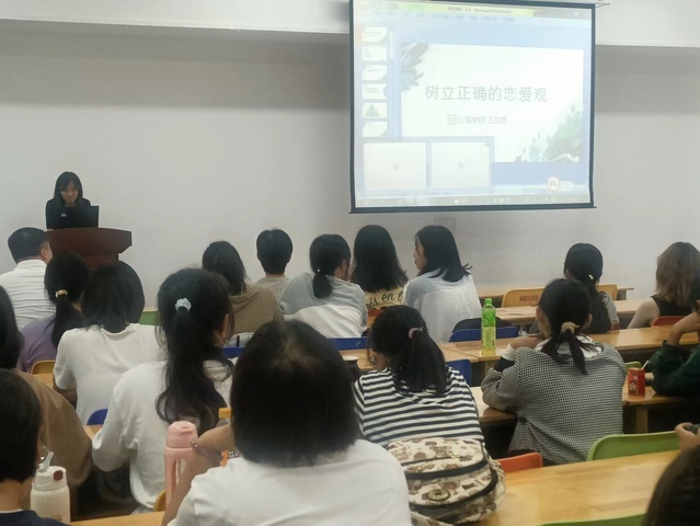 活动伊始,李洪先首先与同学们就近期学习生活的情况进行交流,他指出,大学生活丰富多彩,一要做好个人规划,把学业放在第一位,踏实学习专业知识和专业技能;二要积极参与各项活动,不断提高综合素质;三要积极投身志愿服务,锤炼品格,提高服务奉献意识。之后,王胜男做了“树立正确的恋爱观”专题讲座,她先从“爱是什么”“喜欢与爱的区别”两个角度出发,结合实践和现场互动,对爱的内涵进行深层次解读;紧接着,通过讲解经典爱情问题和恋爱心理理论进一步让同学认识和理解恋爱的表现形式,引导同学正确对待和处理恋爱中的问题;最后,王胜男倡导同学积极树立健康、正确的恋爱观,培养自爱与爱人的能力,端正爱的动机,增进沟通与理解,提升自身应对突发状况的心理能力。