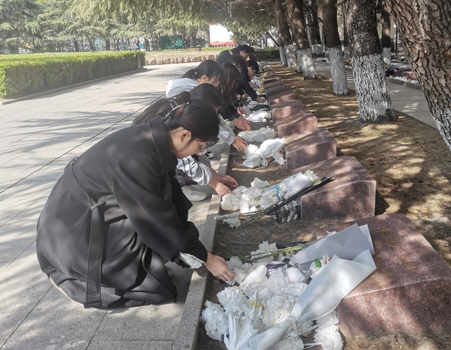 活动前,团总支组织学生使用纸巾制作小白花,在动手实践过程中为故人遥寄哀思。4月2日上午,学生代表佩戴白花,怀着无比崇敬的心情到达潍坊市烈士陵园进行祭英烈仪式,整个活动过程庄严肃穆,井然有序。在革命烈士墓碑前,全体成员列队肃立,鞠躬默哀;随后,学生代表来到革命烈士英名录前瞻仰,追忆往昔峥嵘岁月;最后,大家来到英雄墓碑前,敬献白花以此表达对革命先烈无限的崇敬和深切悼念之情。